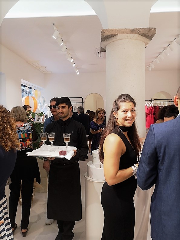 Qui il nostro personale hostess & steward era pronto a dare il benvenuto agli invitati: Davide ha controllato che il flusso delle persone non collmasse il negozio in modo esagerato e Chiara, che indossava uno degli abiti della nuova collezione,  regalava a tutti il gadget firmato Atelier Emé.