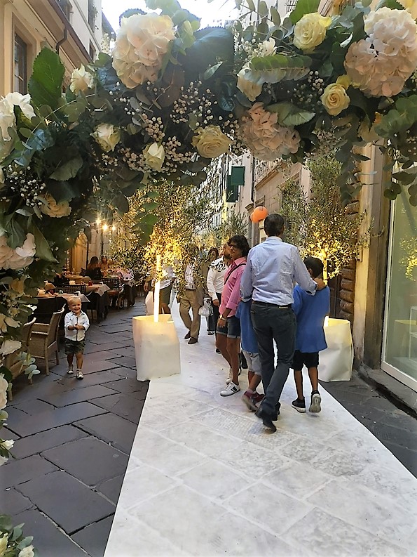 Una guida bianca è stata disposta fino a raggiungere il civico 16 dal Fillungo, dove è stato allestito un arco floreale con bellissimi fiori bianchi.