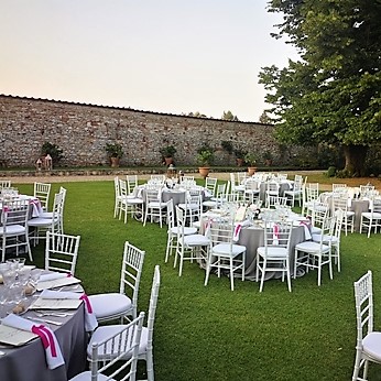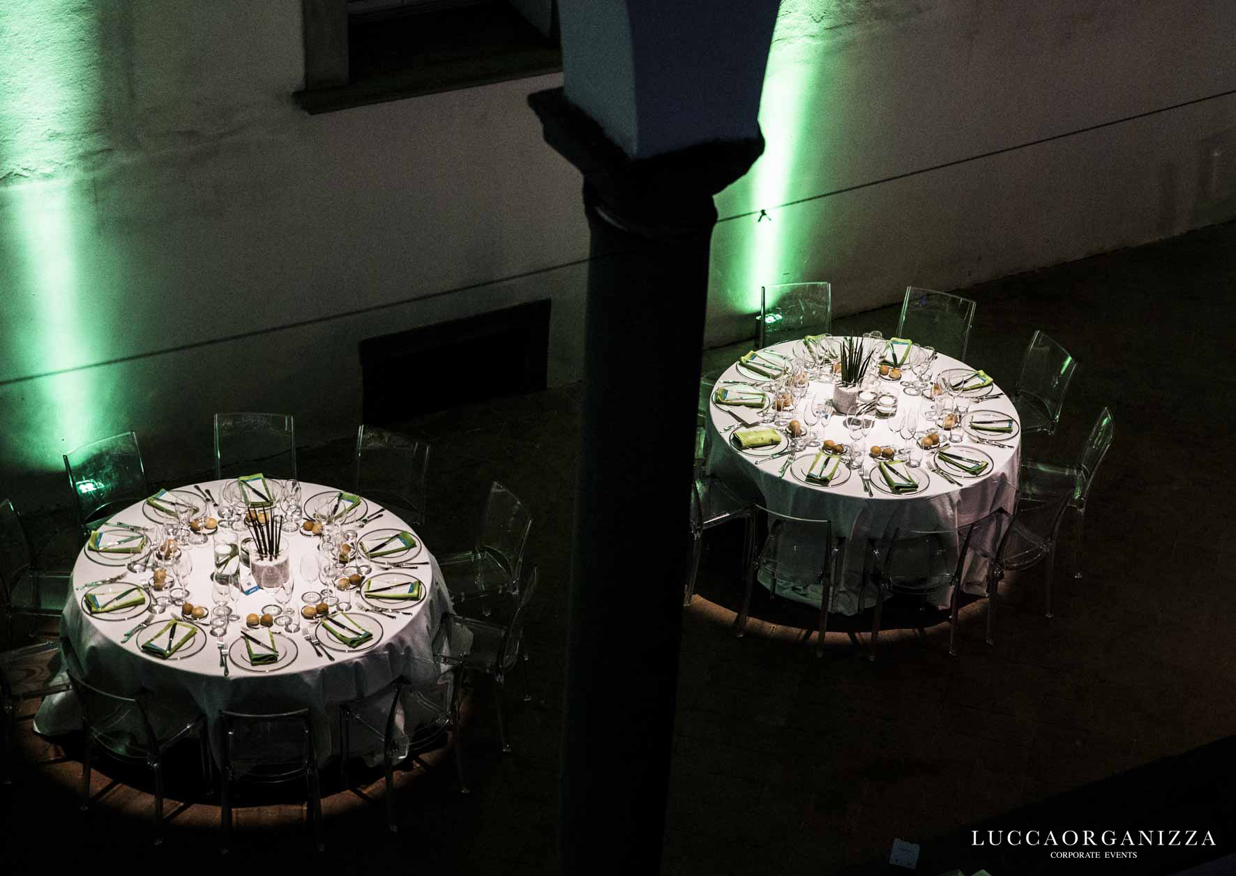 Il chiostro più grande del Real Collegio, è stato allestito con tavoli tondi con tovagliato bianco e sedie kartell trasparenti.