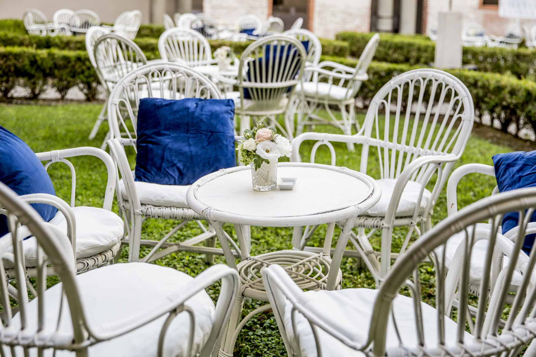 Arredi in vimini total white per l’area dell’aperitivo con cuscini in velluto navy.
