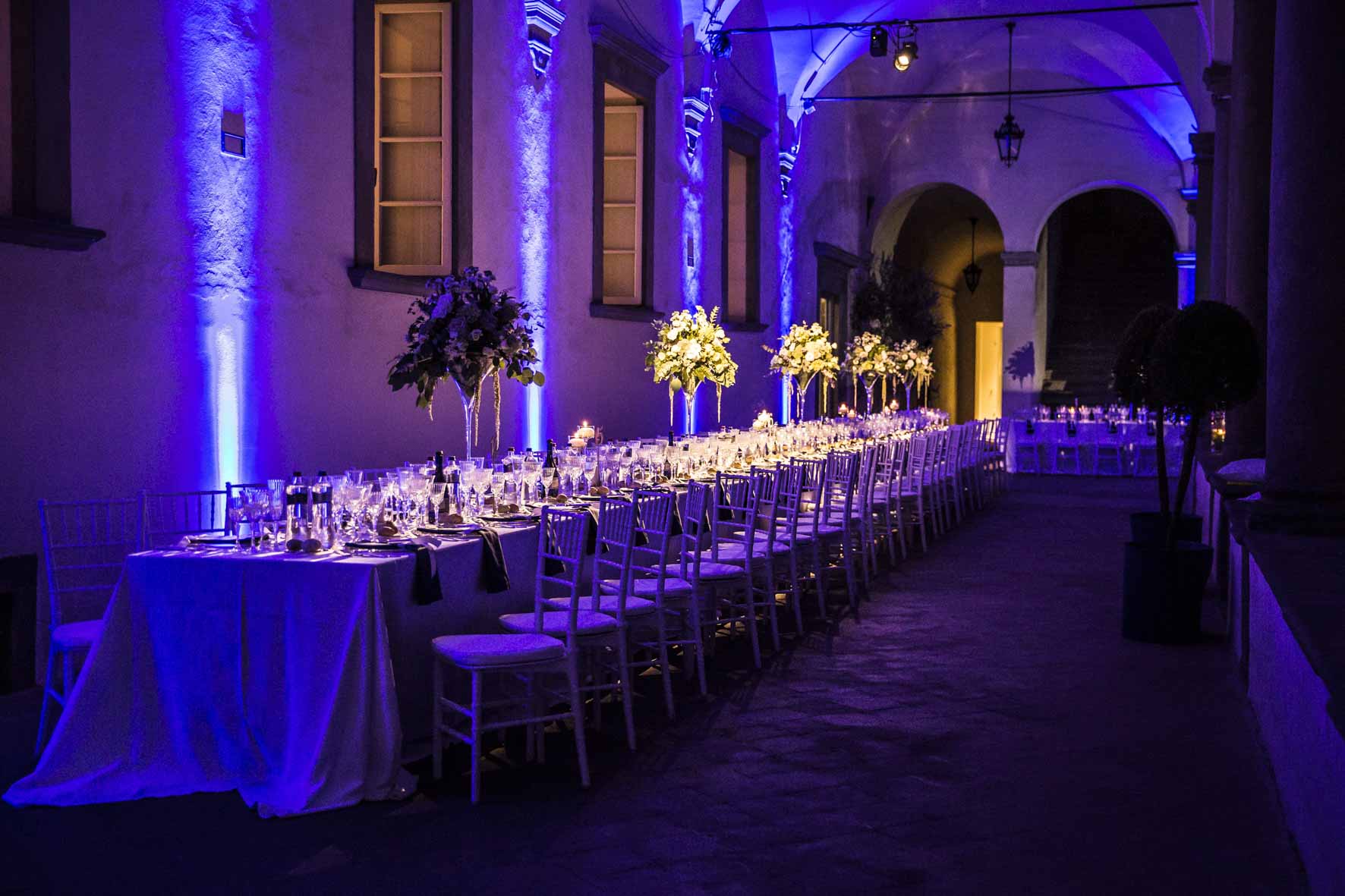 il chiostro centrale è stato reso ancor più suggestivo dai giochi di luce in blu, tre tavole imperiali con tovagliato bianco e un tocco di blu con il tovagliolo in raso.