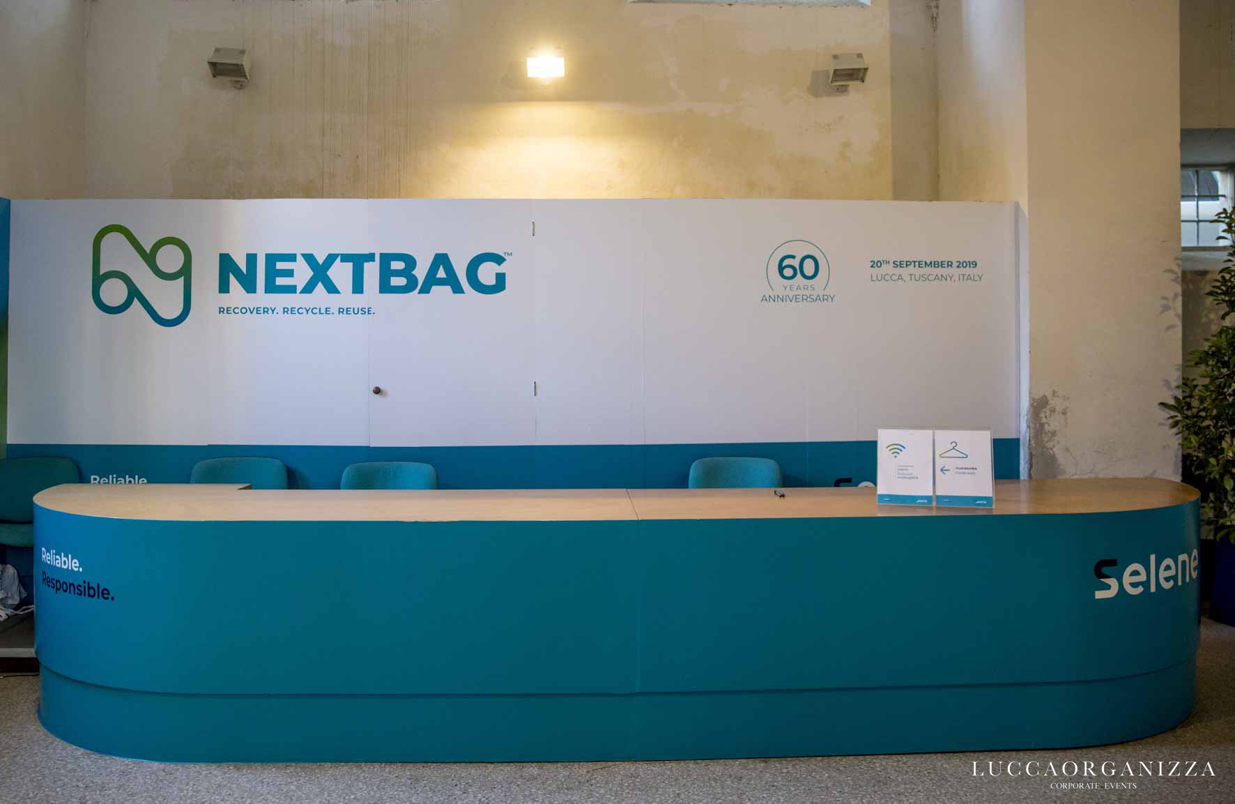 La location è stata impreziosita con piante verdi foderate, arredo e banner logati per rendere forte la presenza aziendale.