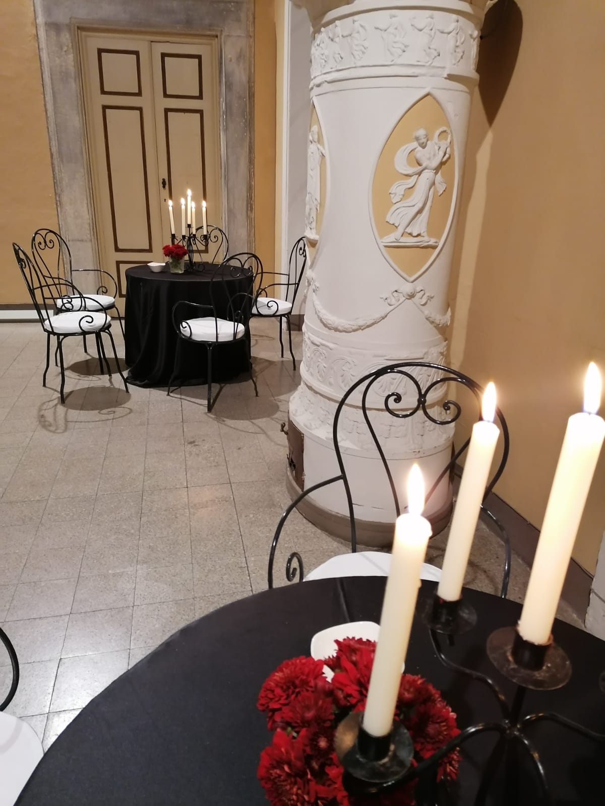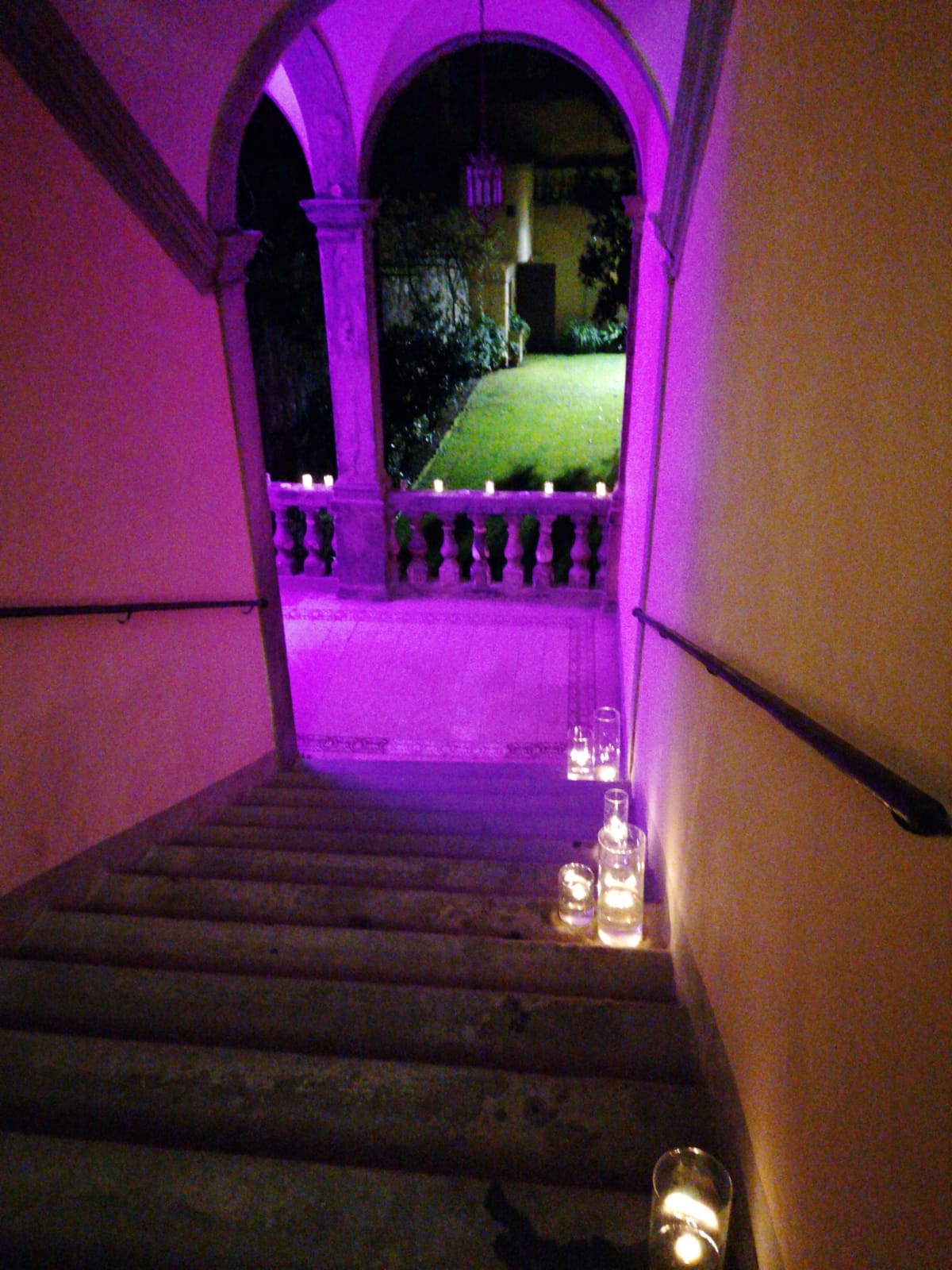 Vasi cilindrici con candele galleggianti hanno illuminato le balaustre del chiostro insieme a lanternoni.